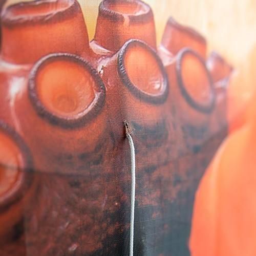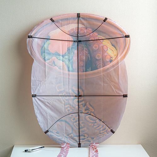 「ひっぱり凧」は、「ひっぱりだこ飯」 の写真をそのまま大きくプリントした凧で あり、糸につながれて空へと引かれていく姿が、まさに“ひっぱりだこ”という名前にふさわしいユーモアあふれる一品です。壺の形状や質感、色合いを忠実に再現したビジュアルを採用し、遠くからでも一目で 「ひっぱりだこ飯」とわかるデザインに仕上げました。